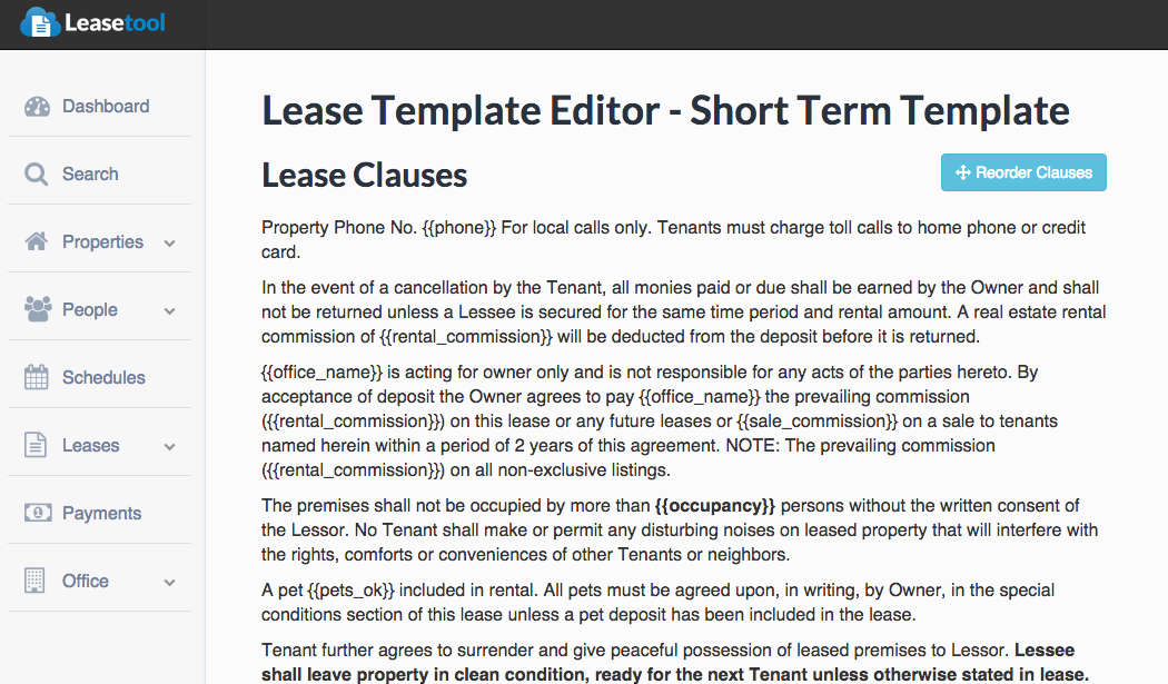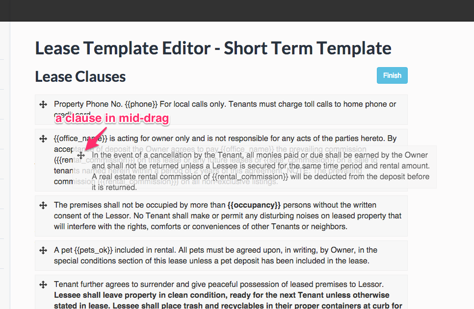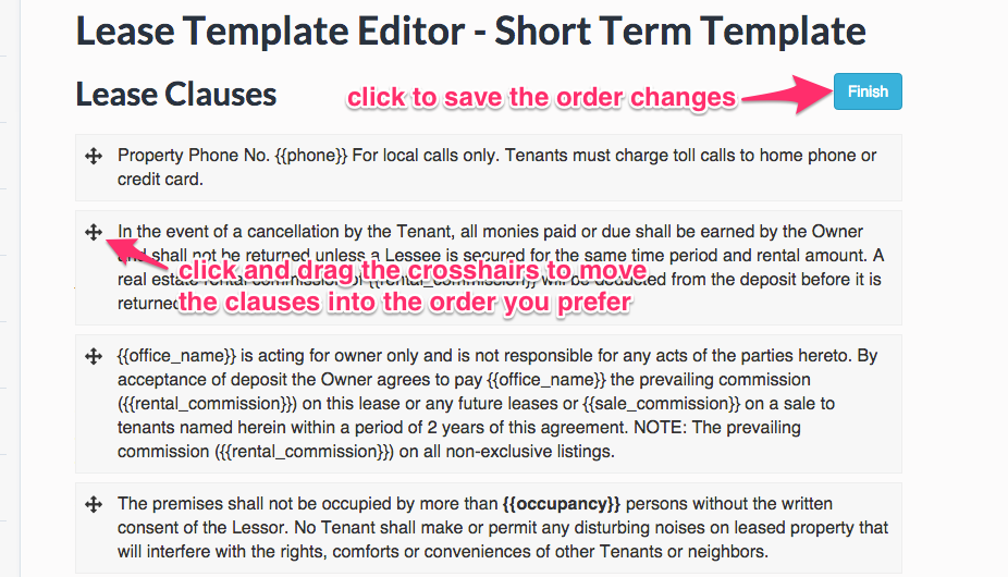 Click the "reorder clauses" button and it switches the lease editor into "reorder" mode. You can now drag the clauses into the order you prefer.