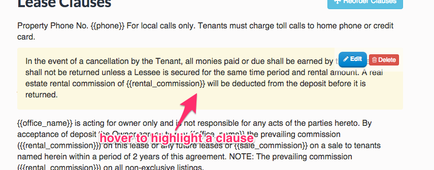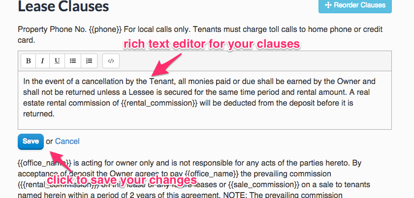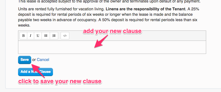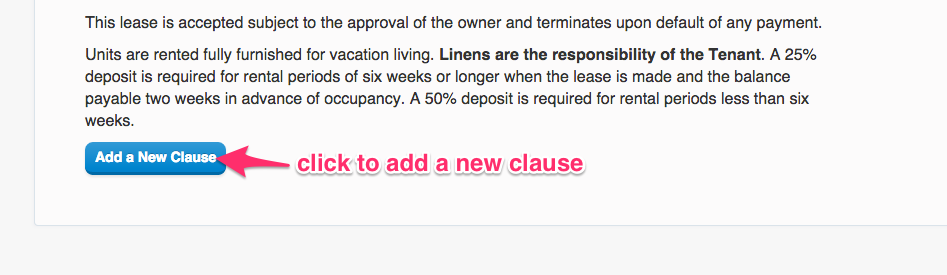 Click the "Add a New Clause" button to instantly add a new clause to your lease template. When you've finished adding your text click "Save" and the new clause is now part of the template.
