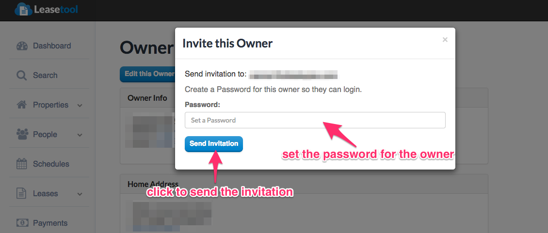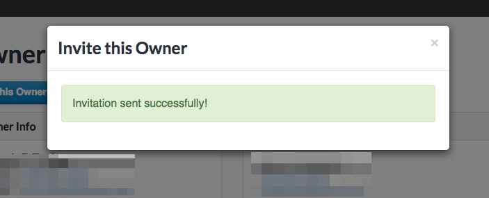 This will launch a modal window so you can set the password for the owner and send them their invitation to login to the system.